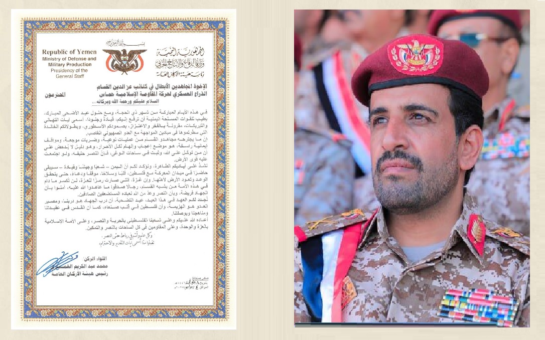 القسام تنشر رسالة هيئة الأركان اليمنية بشأن ثبات الموقف اليمني الشامل المناصر لغزة