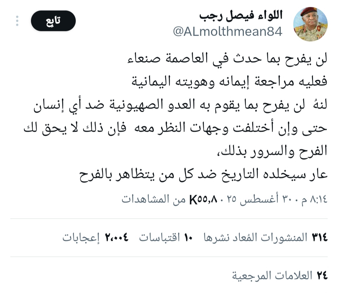 اللواء رجب: من يفرح بما حدث في صنعاء عليه مراجعة إيمانه وهويته اليمانية