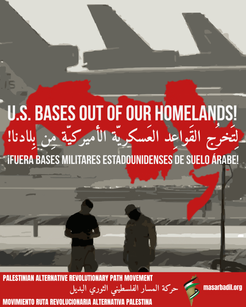 متابعات| المسبرة نت: أكدت "حركة المسار الثوري الفلسطيني البديل" موقفها الثابت بضرورة "طرد كافة القواعد العسكرية الأمريكية والغربية من منطقتنا العربية"، واعتبار "وجودها استعمارًا مباشرًا ومصدرًا دائمًا للعدوان والنهب والإرهاب".