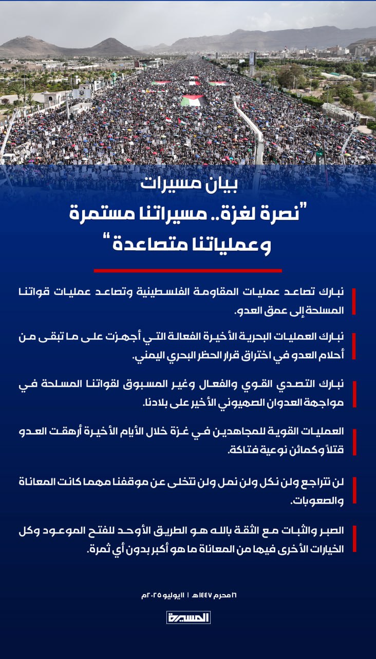 شاهد مليونيتهم وسترى فيهم عزائم الأجداد الأنصار وثبات دعائم ثقافة القرآن وأصالة هوية الحكمة والإيمان وعجائب شجاعة الوقوف في مواجهة الصهيونية والنفاق والإجرام.— قناة المسيرة (@TvAlmasirah) July 11, 2025