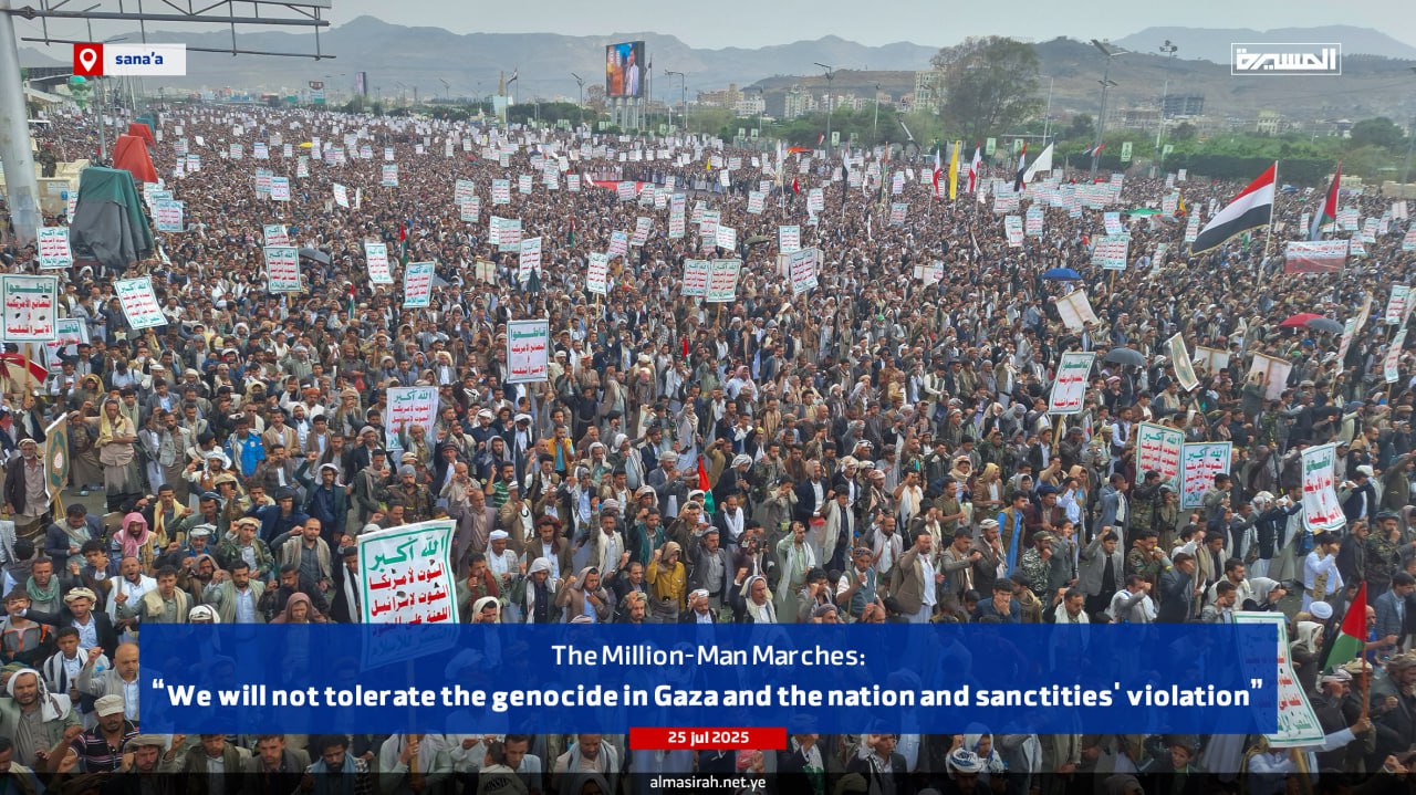 وفي مليونية "لن نتهاونَ أمام إبادة غزة واستباحة الأُمَّــة ومقدَّساتها"، تقاطر ملايينُ اليمانيين الأحرار من كافة مديريات وعزل أمانة العاصمة ومحافظة صنعاء، حتى فاض ميدانُ السبعين، وامتلأت المربعاتُ المستحدثة على جوانب الساحة وفي الطرق الفرعية المؤدية إليه، واستمر الحضورُ في التوافد حتى اللحظات الأخيرة للمسيرة.