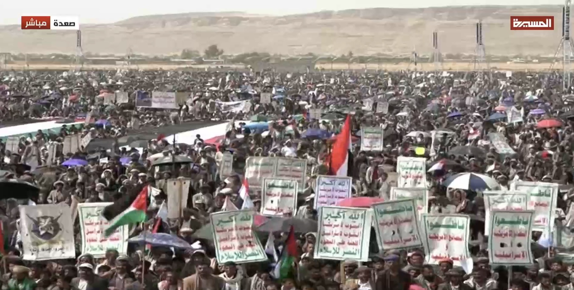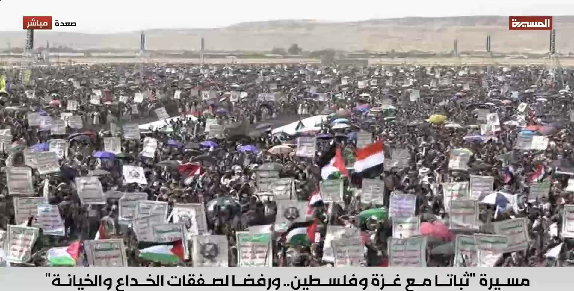 جاء ذلك في الاحتشاد الجماهيري غير المسبوق الذي شهدته 39 ساحة متفرقة في صعدة، اليوم الجمعة، تحت شعار "ثباتا مع غزة وفلسطين، ورفضا لصفقات الخداع والخيانة"، والتي تركزت على ساحتي المولد النبوي الشريف بمركز المحافظة، والشهيد القائد بخولان عامر، وساحات عرو وجمعة بني بحر، وذويب بحيدان، وشعارة والحجلة وبني صياح وبنلقم برازح، وربوع الحدود ومدينة جاوي وبني عباد وولد عمر في مجز، والجرشة بغمر، ومركز مديرية قطابر والجفرة وعضلة، والسهلين والحجر في آل سالم، والخميس وآل مقنع ونيد البارق في منبه، وساحة شدا، ومركز مديرية كتاف وأملح والعقيق، ويسنم في باقم، وعزلتي الرحمانين وبقامة في غمر، وساحات غافرة ووادي ليه وبني سعد ووالبه وبني ذهل وقيس والعوشة في مديرية الظاهر، ومذاب في الصفراء.