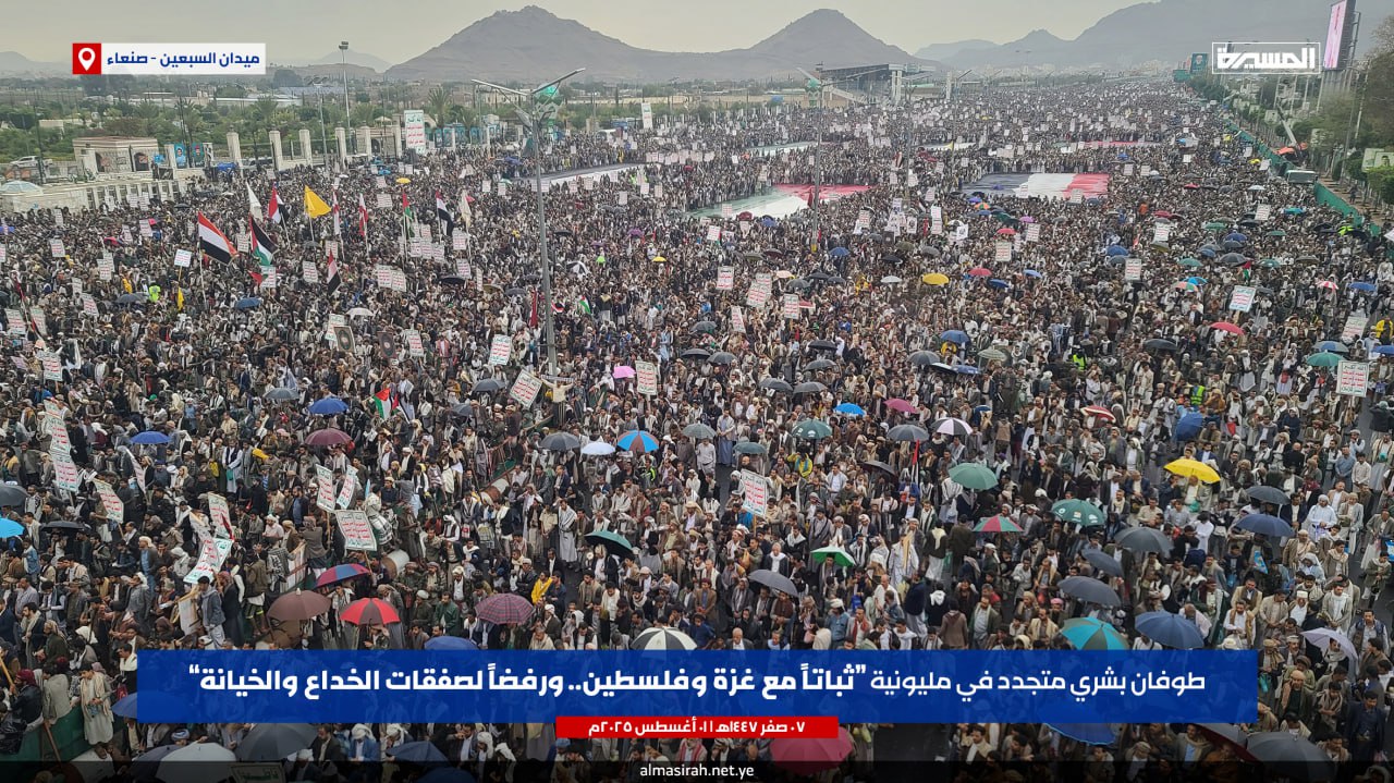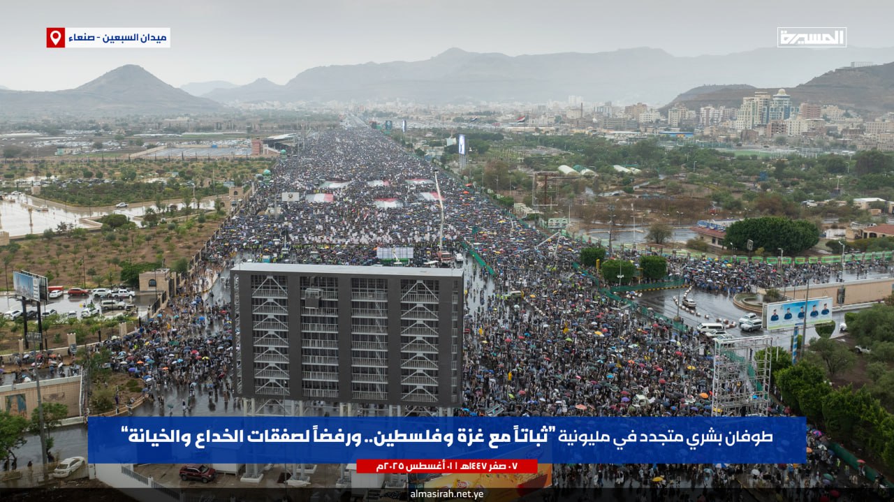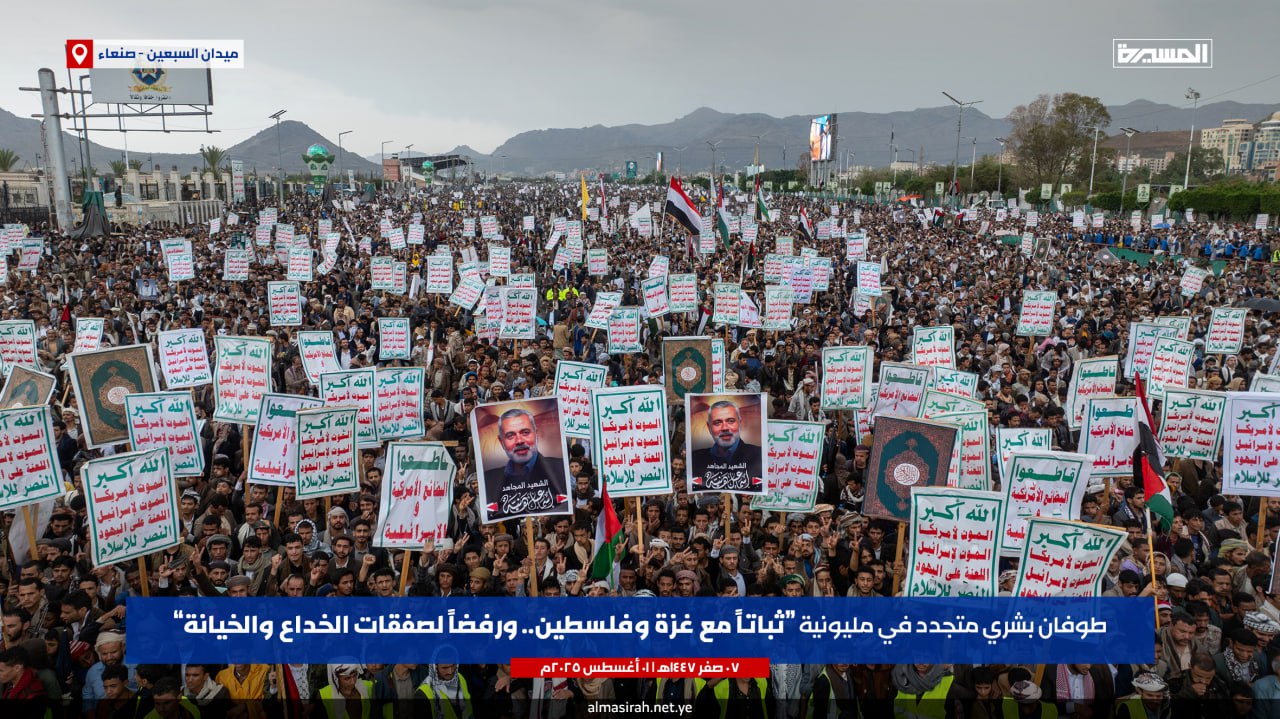مليونية "ثباتا مع غزة وفلسطين.. ورفضا لصفقات الخداع والخيانة" #صنعاء #ميدان_السبعين#ثابتون_مع_غزة #نرفض_صفقات_الخيانة pic.twitter.com/Qgn29E4lNqبيان مليونية "ثباتا مع غزة وفلسطين.. ورفضا لصفقات الخداع والخيانة" بـ #ميدان_السبعين في العاصمة #صنعاء | 07-02-1447هـ 01-08-2025م#ثابتون_مع_غزة #أين_أنتم_يا_عرب pic.twitter.com/irjnvZjFty— قناة المسيرة (@TvAlmasirah) August 1, 2025