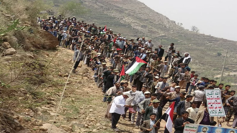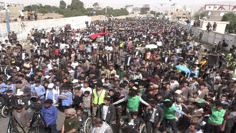 طلاب مدارس مدينة عمران في مسيرة حاشدة باستمرار جرائم الإبادة الصهيونية في غزة.