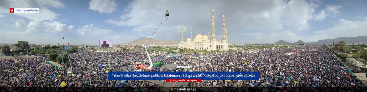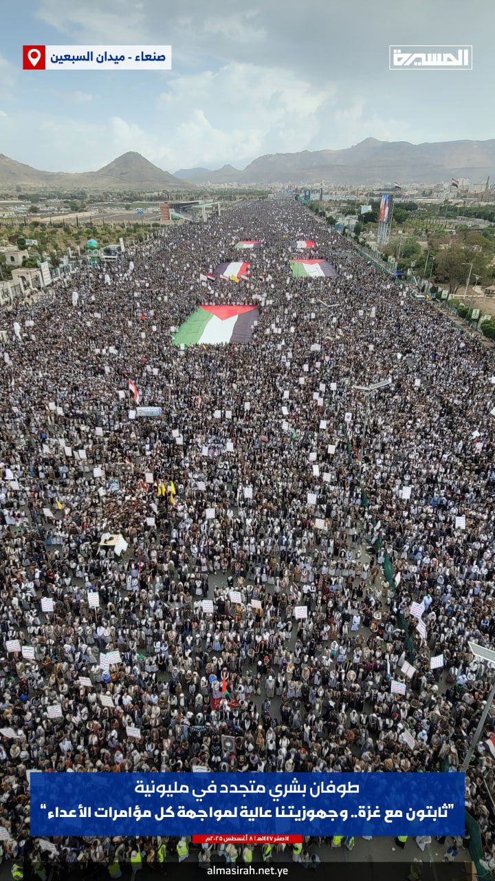 بيان مليونية "ثابتون مع غزة.. وجهوزيتنا عالية لمواجهة كل مؤامرات الأعداء" بـ #ميدان_السبعين في العاصمة #صنعاء | 14-02-1447هـ 08-08-2025م#ثابتون_مع_غزة #الشعوب_مع_سلاح_المقاومة pic.twitter.com/6r4UaIXeWn— قناة المسيرة (@TvAlmasirah) August 8, 2025
