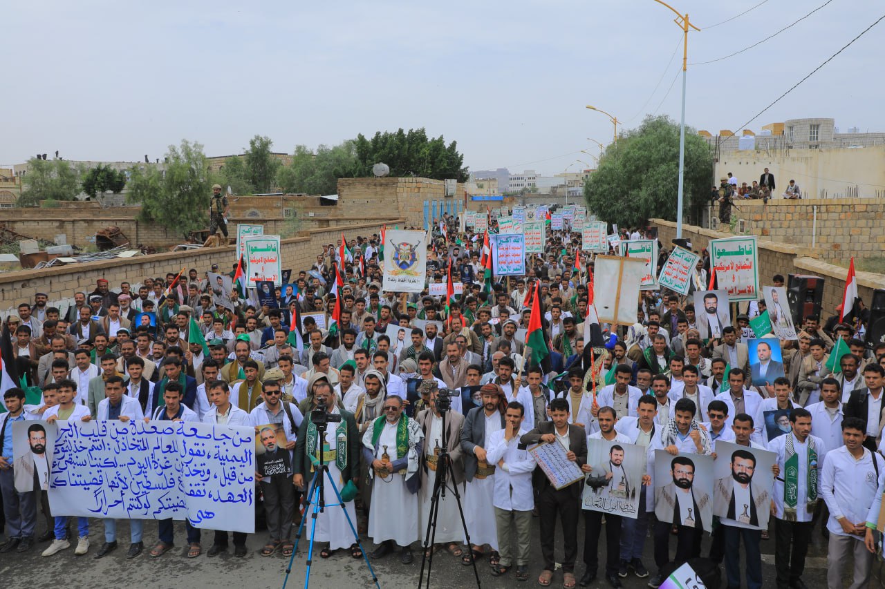 حناجرهم بالهتافات، في مشهد جسّد وعي الجامعة والتزامها بقضايا الأُمَّــة، مؤكّـدين