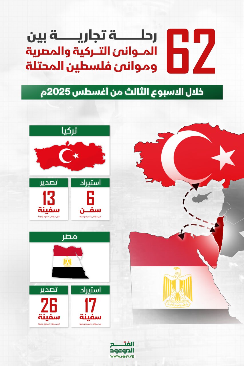 أظهرت مواقع ملاحية دولية استمرار تدفق السفن التجارية القادمة من تركيا ومصر باتجاه الموانئ الصهيونية المحتلة، وذلك للأسبوع الثالث على التوالي من شهر أغسطس الجاري.