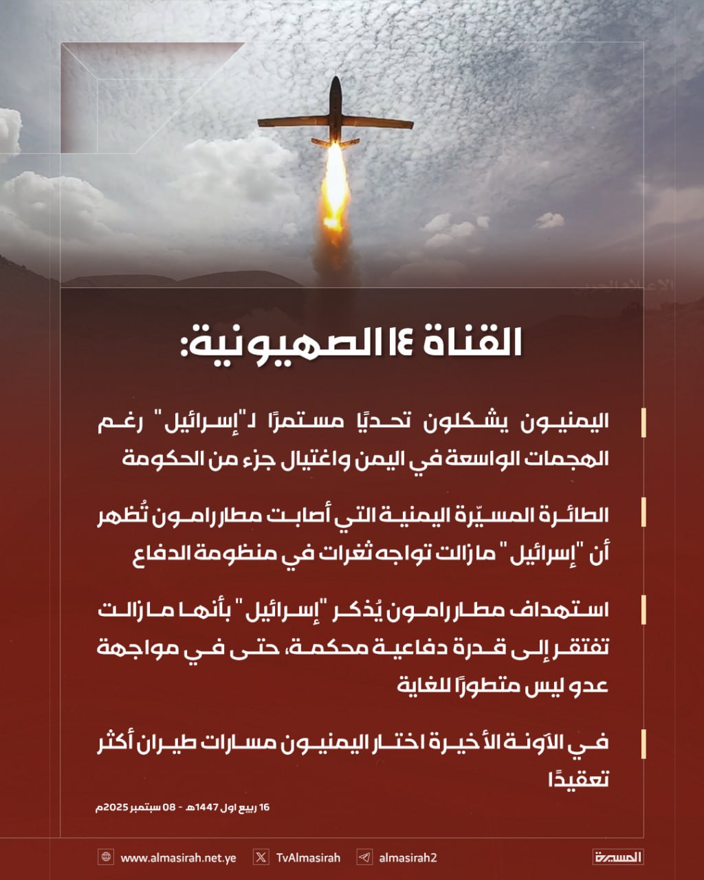 القناة 14 الصهيونية: في الآونة الأخيرة اختار اليمنيون مسارات طيران أكثر تعقيدًا