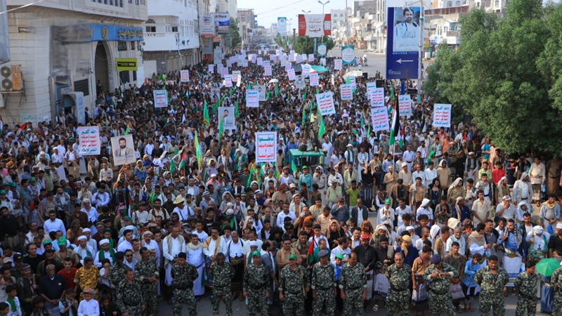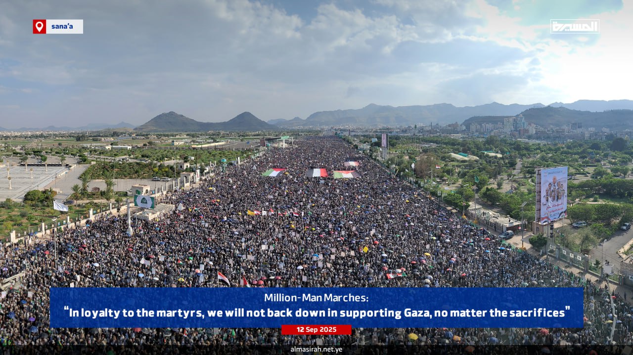وعلى وَقْعِ توسّع جرائم العدوّ الصهيوني بحق الشعبَين اليمني والفلسطيني، وتماديه في فرض معادلة الاستباحة للبلدان والشعوب العربية والإسلامية بعد القصف الغادر على مقر وفد حركة المقاومة الإسلامية حماس في العاصمة القطرية الدوحة، حمل اليمانيون عنوانًا جامعًا لمسيراتهم التي خرجت في نحو 1490 ساحة بصنعاء وعموم المحافظات والمناطق الحرة، تحت شعار "وفاءً للشهداءِ.. لن نتراجعَ في إسنادِ غزةَ مهما كانت التضحيات".