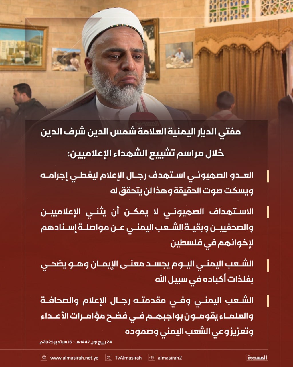 أكد مفتي الديار اليمنية، العلامة شمس الدين شرف الدين، أن العدو الصهيوني استهدف رجال الإعلام لمحاولة تغطية إجرامه وإسكات صوت الحقيقة، مشددًا على أن هذه المحاولة لن تتحقق له.