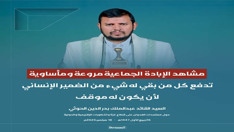 المسيرة نت| خاص: أكد السيد القائد عبد الملك بدرالدين الحوثي -يحفظه الله- أن مشاهد الإبادة الجماعية التي يرتكبها العدوّ الصهيوني بحق أبناء الشعب الفلسطيني في قطاع غزة مروعة ومأساوية، وتدفع كل من بقي لديه شيء من الضمير الإنساني لأن يتخذ موقفًا.