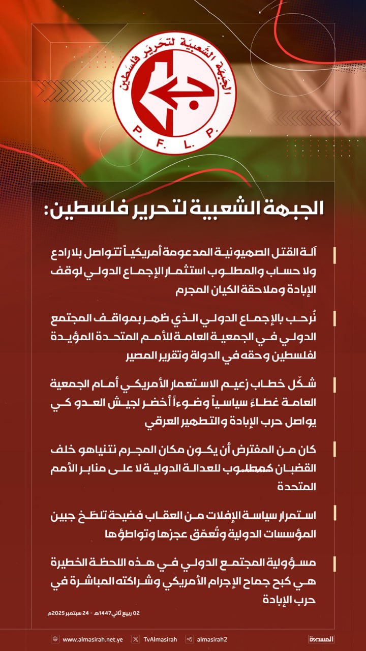 قالت الجبهة الشعبية لتحرير فلسطين، إن آلة القتل الصهيونية المدعومة أمريكياً تتواصل بلا رادع ولا حساب، مؤكدة أن المطلوب استثمار الإجماع الدولي لوقف الإبادة وملاحقة الكيان المجرم.