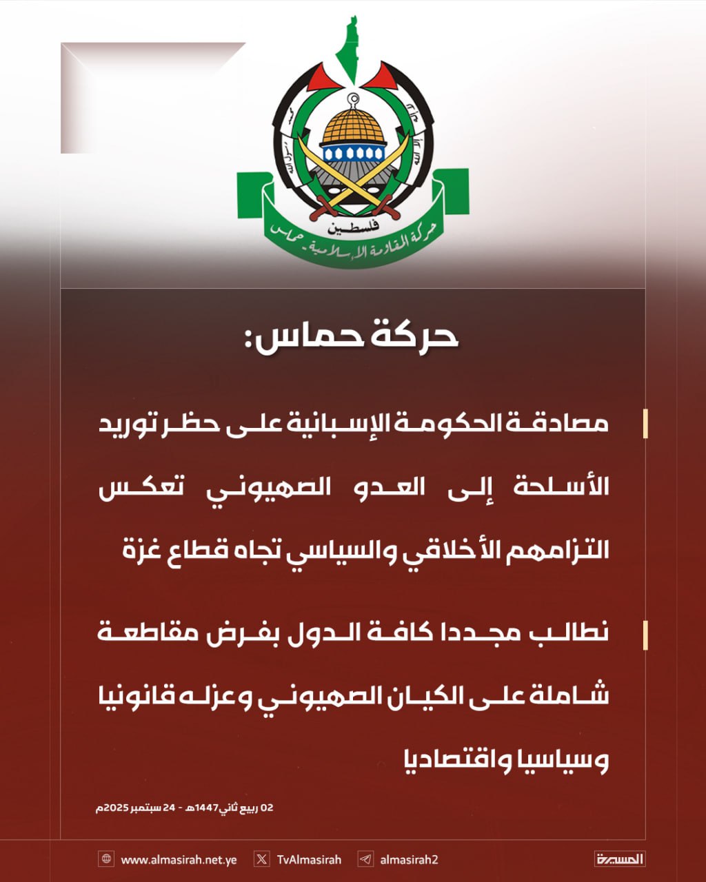 رحّبت حركة المقاومة الإسلامية (حماس) بمصادقة الحكومة الإسبانية على قرار حظر توريد الأسلحة إلى الكيان الصهيوني، معتبرة ذلك خطوة تعكس التزاماً أخلاقياً وسياسياً تجاه ما يتعرض له قطاع غزة من عدوان وحصار متواصل.