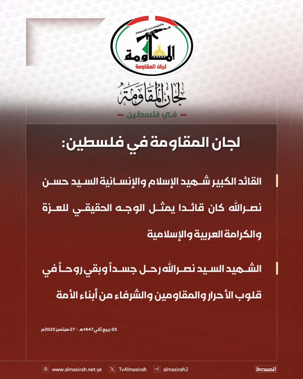 لجان المقاومة: الشهيد نصر الله جسّد العزة والكرامة وبقي روحًا في قلوب الأحرار