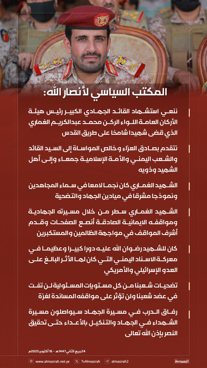 المسيرة نت| صنعاء: نعى المكتب السياسي لحركة أنصار الله، رئيس هيئة الأركان العامة اللواء الركن محمد عبد الكريم الغُمَاري، الذي "قضى شهيدًا شامخًا على طريق القدس على يد الصهاينة المجرمين".