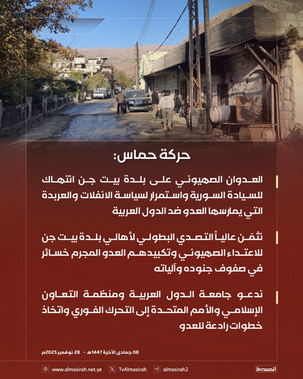 علقت حركة المقاومة الإسلامية (حماس) بشأن العدوان الصهيوني الإجرامي الذي استهدف بلدة بيت جن جنوب سوريا، وأسفر عن استشهاد عدد من المدنيين السوريين الأبرياء، بينهم أطفال.