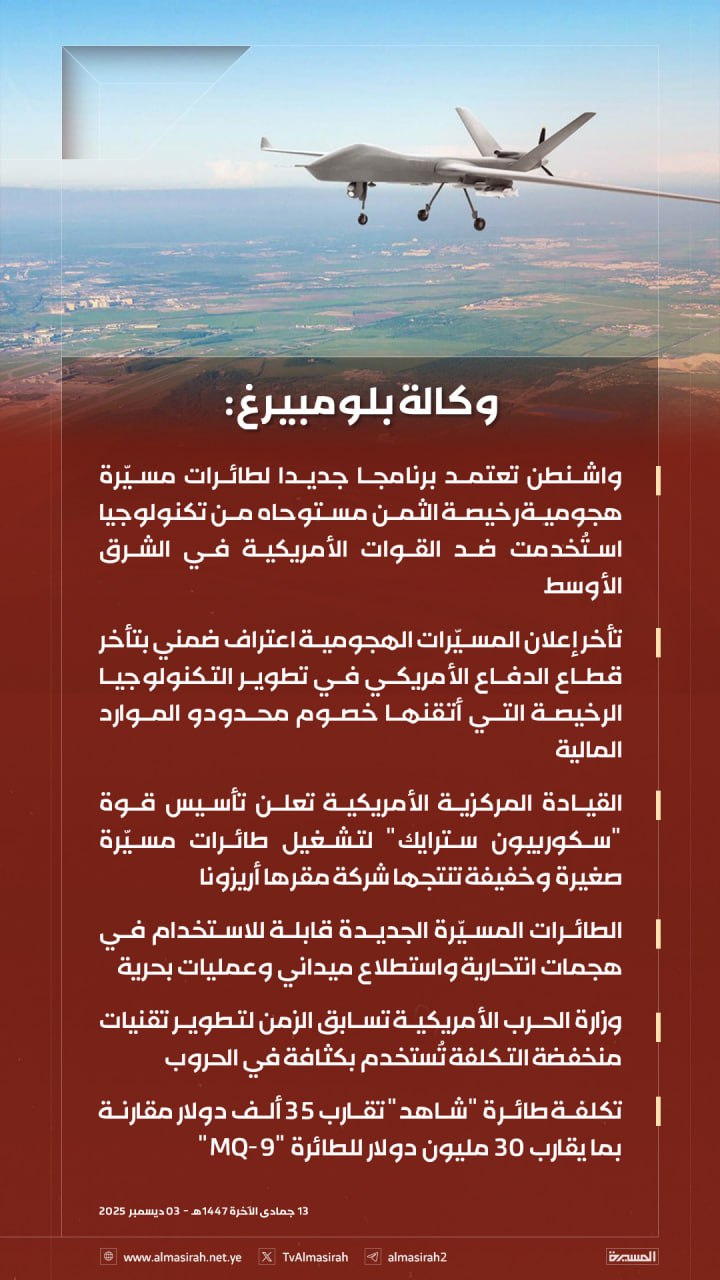 أفادت وكالة "بلومبيرغ" الأمريكية أن واشنطن اعتمدت برنامجًا جديدًا لتطوير واستخدام طائرات مسيّرة هجومية رخيصة الثمن، مشيرة إلى أن هذه التكنولوجيا مستوحاة بشكل مباشر من التقنيات التي استخدمت ضد القوات الأمريكية في المنطقة.-