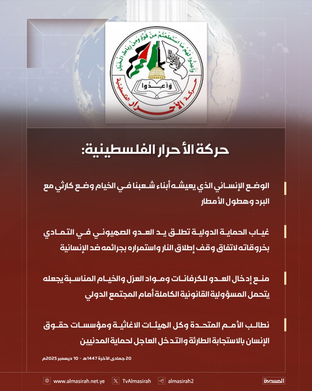 وأكدت الحركة في بيان صادر عنها اليوم الأربعاء، أن غياب الحماية الدولية أتاح للعدو الصهيوني الاستمرار في انتهاكاته لوقف إطلاق النار وجرائمه ضد الإنسانية دون أي محاسبة، مشددة على أن منع الاحتلال إدخال الكرفانات ومواد العزل والخيام المناسبة يجعله مسؤولاً قانونياً أمام المجتمع الدولي عن تبعات الكارثة الإنسانية.