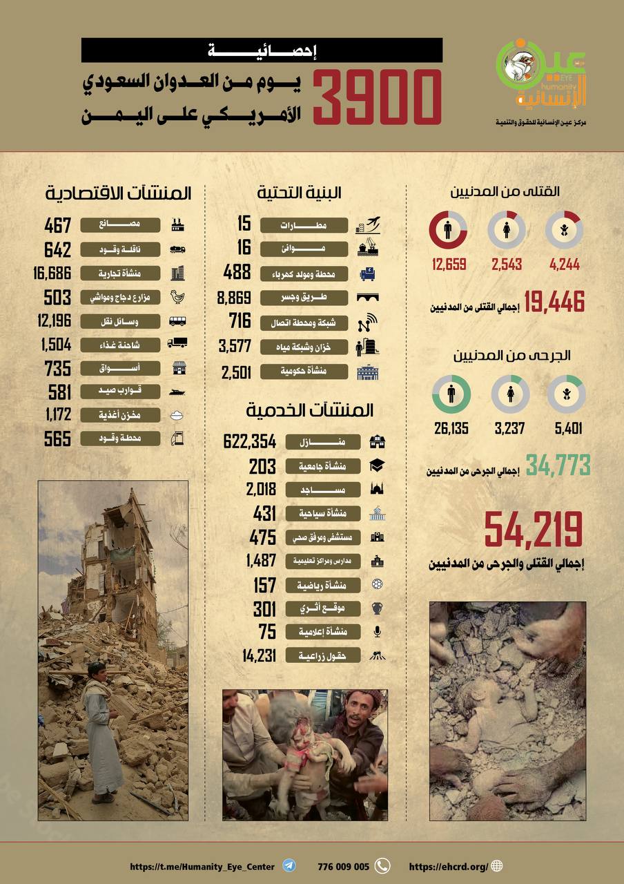 مركز عين الإنسانية يكشف بالأرقام جرائم العدوان الأمريكي السعودي خلال3,900 يوم من العدوان والحصار على اليمن