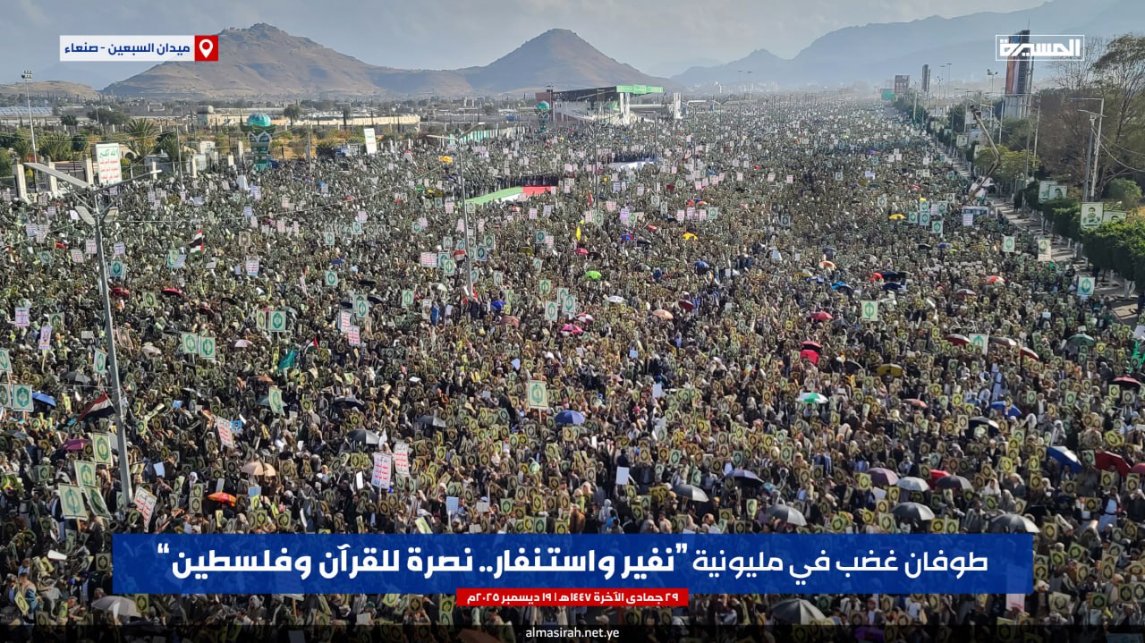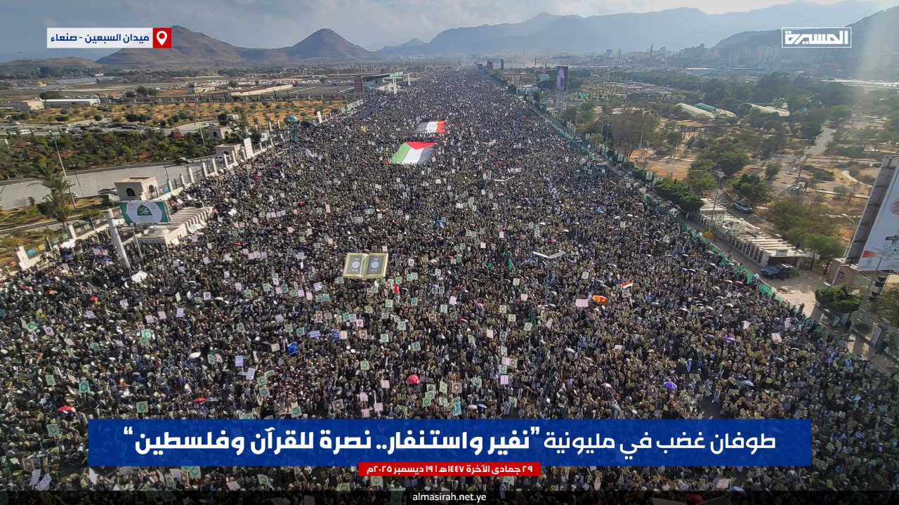 بيان مليونية (نفير واستنفار.. نصرة للقرآن وفلسطين) بـ #ميدان_السبعين في #صنعاء | 29-06-1447هـ 19-12-2025م#شعب_الإيمان_يغضب_للقرآن pic.twitter.com/5pDOFQzJH5— قناة المسيرة (@TvAlmasirah) December 19, 2025