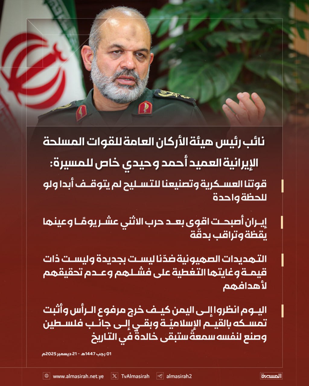 وفي تصريح خاص لقناة المسيرة، أوضح العميد وحيدي أن إيران أصبحت أقوى بعد حرب الاثني عشر يومًا، مشددًا على أن التجربة عززت الجاهزية العسكرية ورفعت مستوى التنسيق والاستعداد في مختلف وحدات القوات المسلحة.