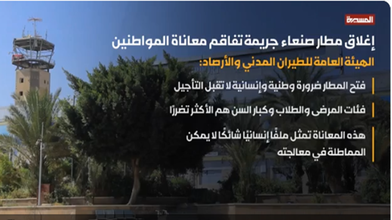 المسيرة نت| صنعاء: أكد القائم بأعمال رئيس الهيئة العامة للطيران المدني والأرصاد عارف مصلح أن استمرار إغلاق مطار صنعاء الدولي في ظل القيود والصعوبات التي يواجهها المسافرون عبر مطار عدن، أدى إلى تفاقم معاناة المواطنين بشكل غير مسبوق.