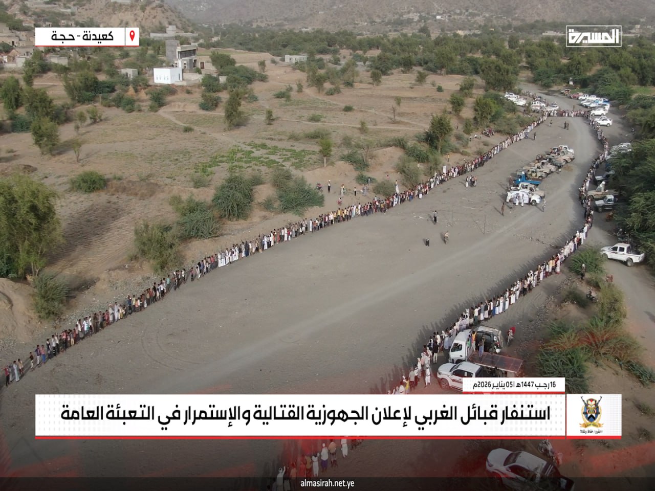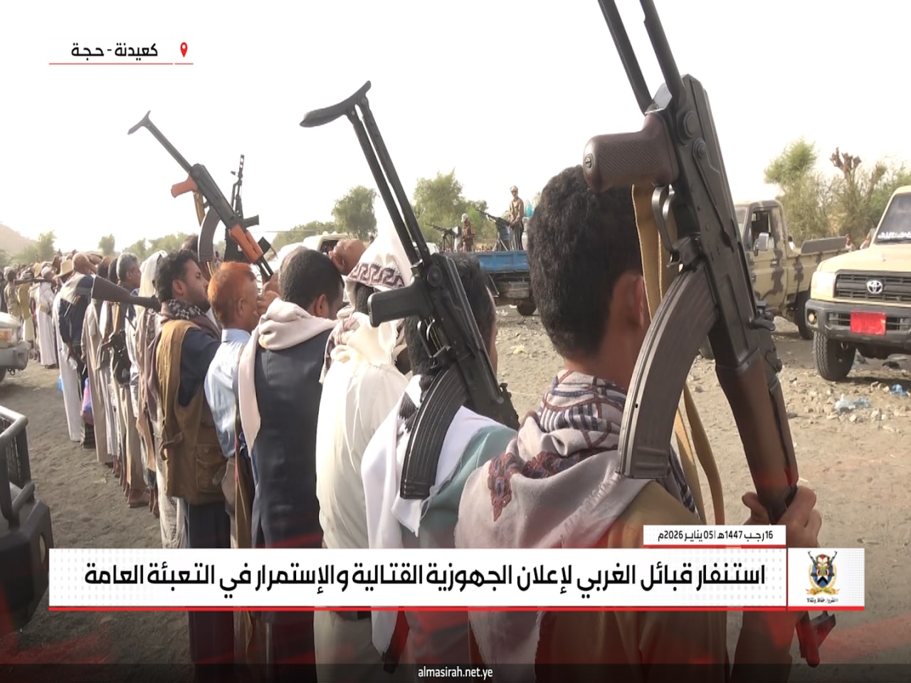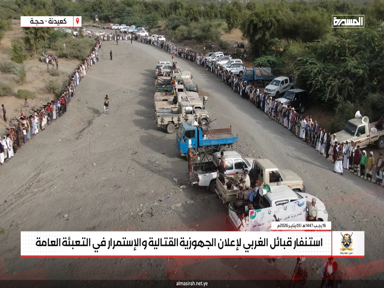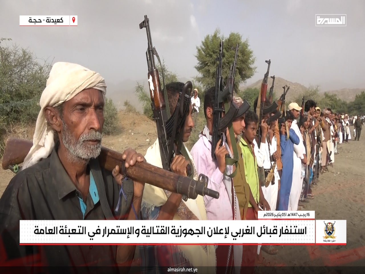 المسيرة نت | حجة: جدّدت قبائل عزلة الغربي في مديرية كعيدنة بمحافظة حجة، الاثنين، موقفها الثابت بالجهوزية الكاملة والاستنفار العام لمواجهة أي تصعيد عدواني صهيوني أمريكي قد يستهدف اليمن أو قطاع غزة، في إطار الالتزام بالدفاع عن الوطن ودعم الشعب الفلسطيني.