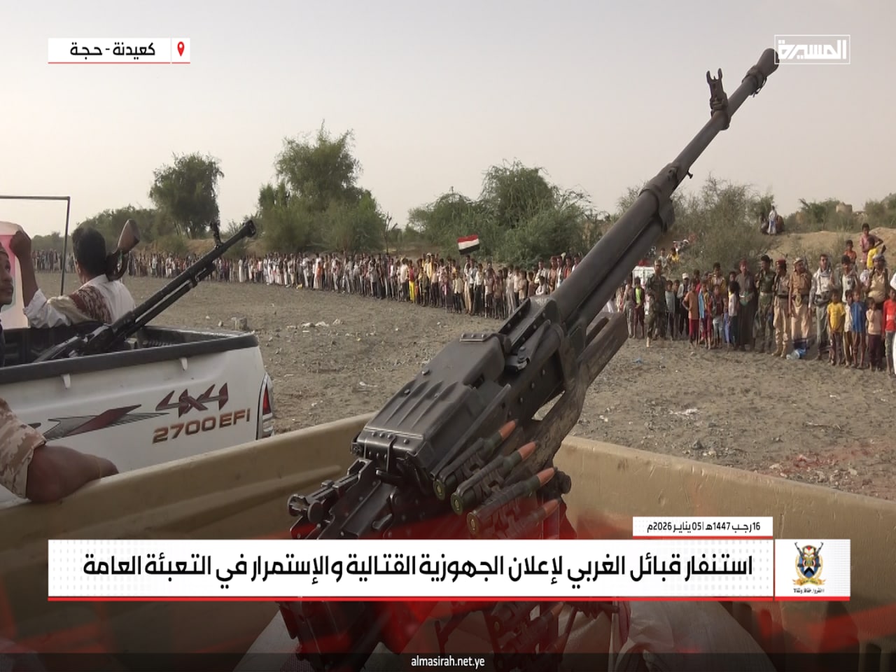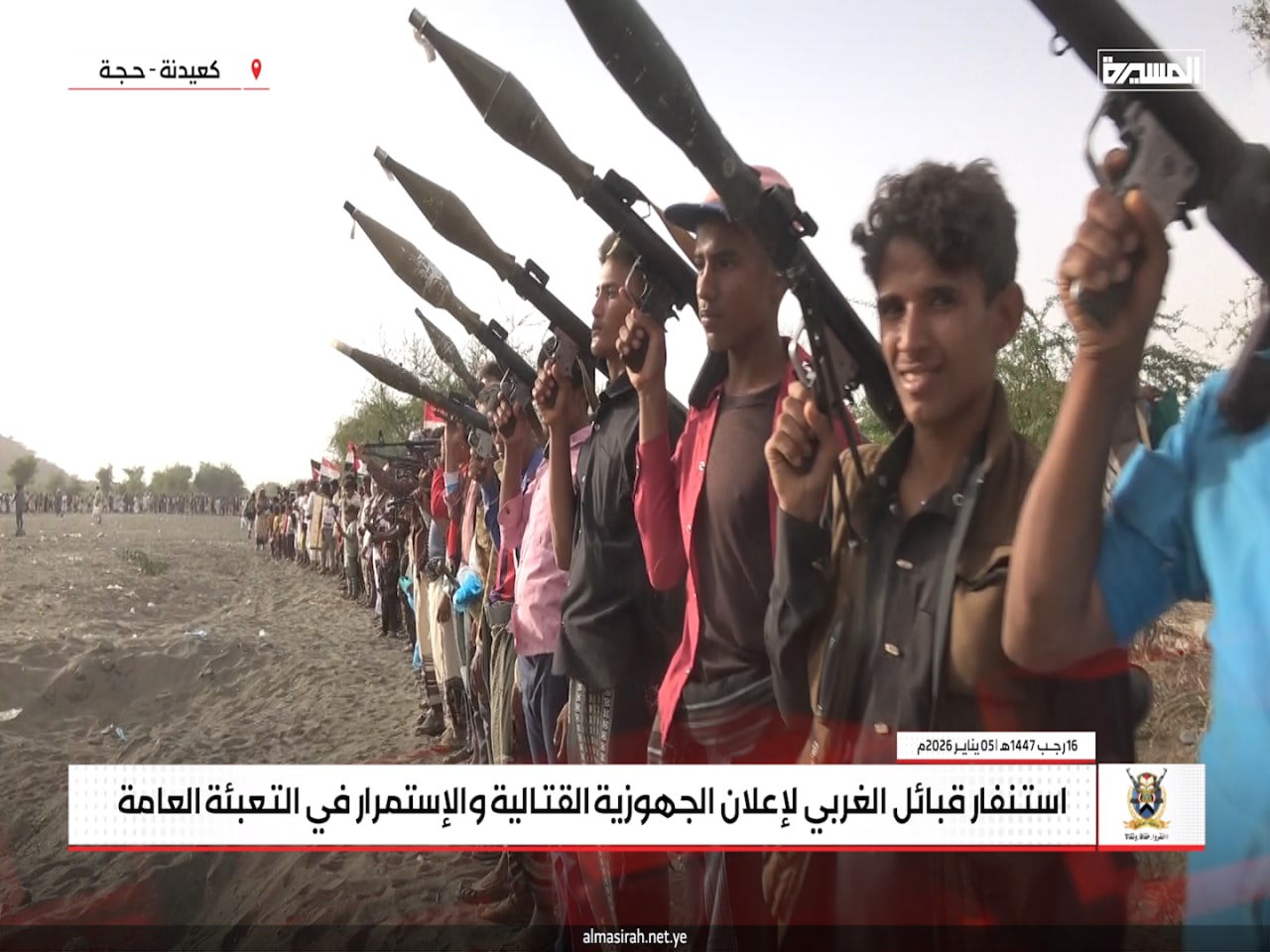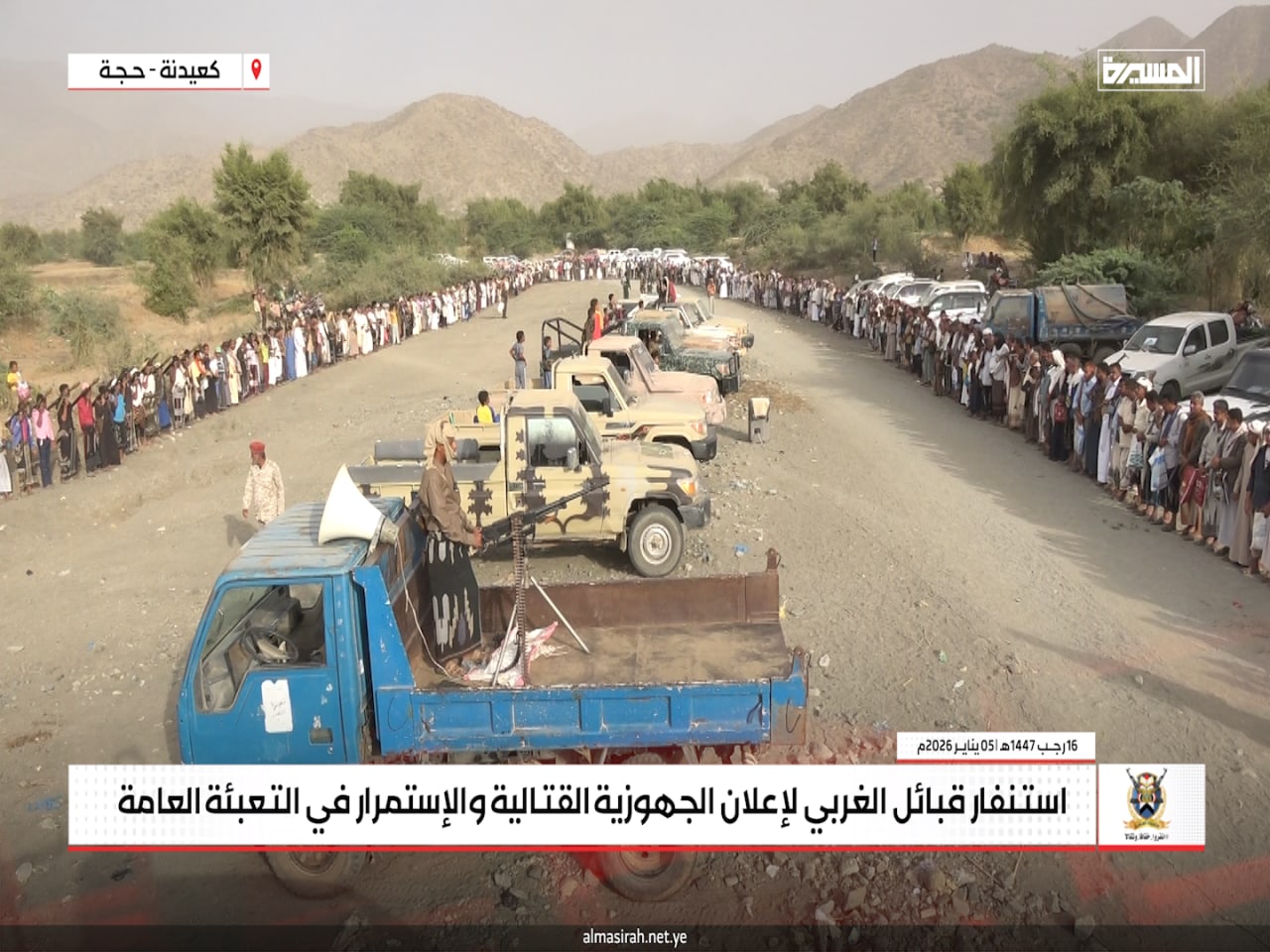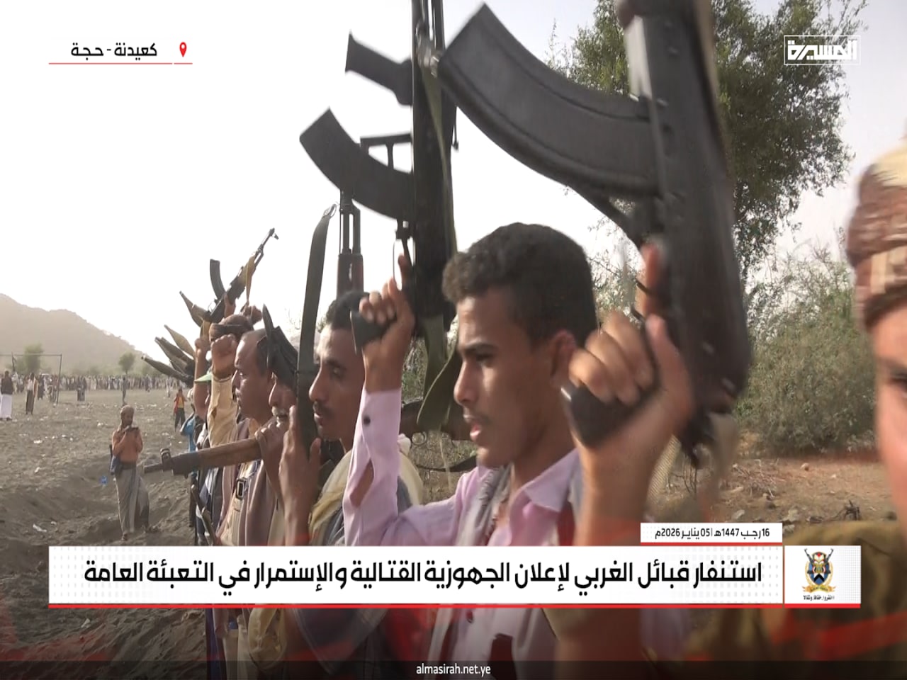 المسيرة نت | حجة: جدّدت قبائل عزلة الغربي في مديرية كعيدنة بمحافظة حجة، الاثنين، موقفها الثابت بالجهوزية الكاملة والاستنفار العام لمواجهة أي تصعيد عدواني صهيوني أمريكي قد يستهدف اليمن أو قطاع غزة، في إطار الالتزام بالدفاع عن الوطن ودعم الشعب الفلسطيني.