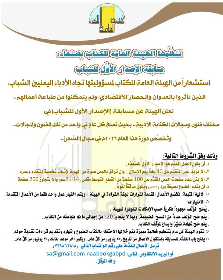 المسيرة نت | صنعاء: تطلق الهيئة العامة للكتاب بصنعاء مسابقة الإصدار الأول للشباب في مختلف فنون ومجالات الكتابة الأدبية.