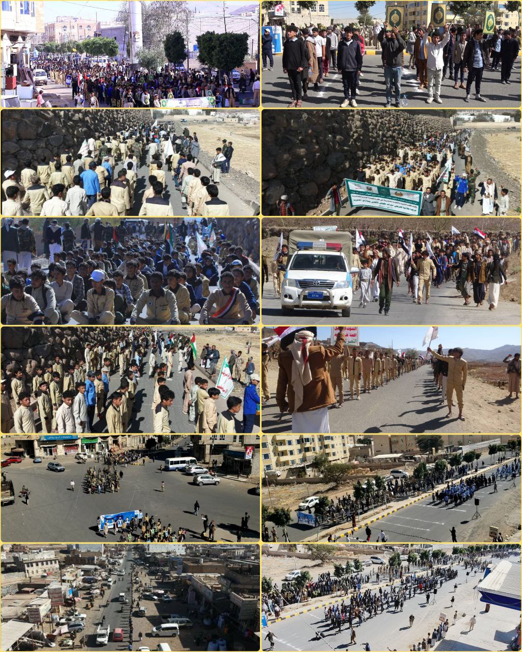 المسيرة نت | خاص: احتضنت مديريات بني حشيش وبني مطر وصنعاء الجديدة بمحافظة صنعاء، اليوم، مسيرات طلابية وعروضًا كشفية لخريجي دورات طوفان الأقصى من طلاب المدارس الثانوية، استمرارًا في التعبئة العامة وإحياءً للذكرى السنوية لشهيد القرآن السيد حسين بدرالدين الحوثي رضوان الله عليه، وبمشاركة واسعة عكست مستوى التفاعل والحضور الطلابي.