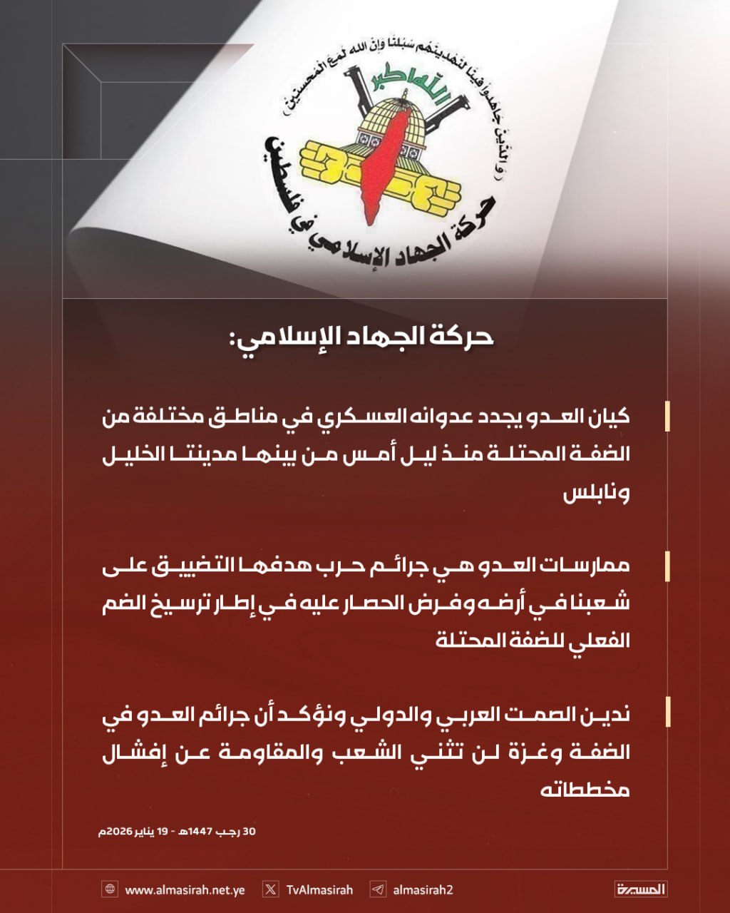 الجهاد الإسلامي: عدوان صهيوني متجدد على الضفة وجرائم حرب لترسيخ الضم وصمت دولي مدان