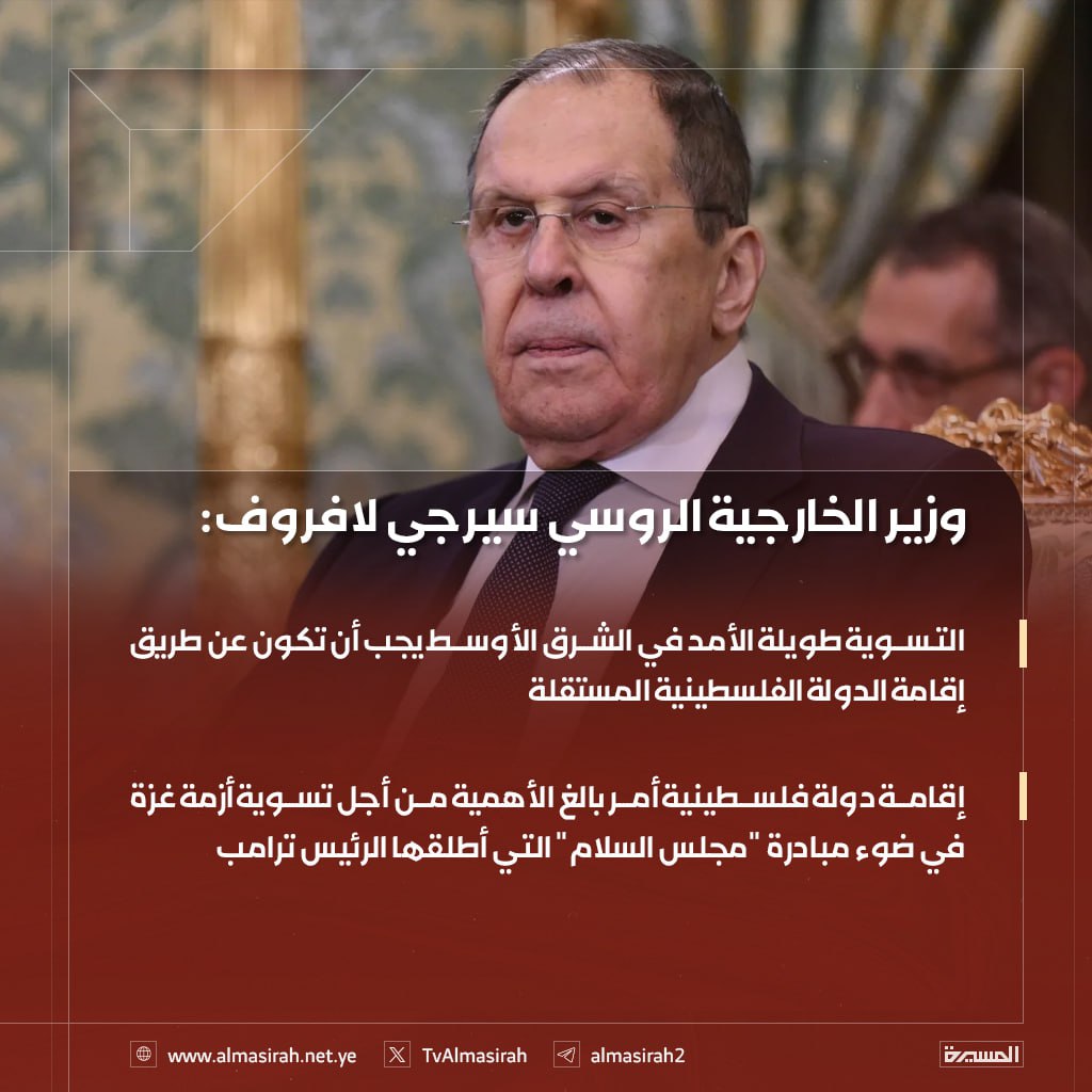 أكد وزير الخارجية الروسي سيرجي لافروف، أن التسوية طويلة الأمد في المنطقة لا يمكن أن تتحقق إلا عبر إقامة الدولة الفلسطينية المستقلة، مشدداً على أن هذه الخطوة تُعد جوهرية لإنهاء الصراع وضمان السلام في المنطقة.