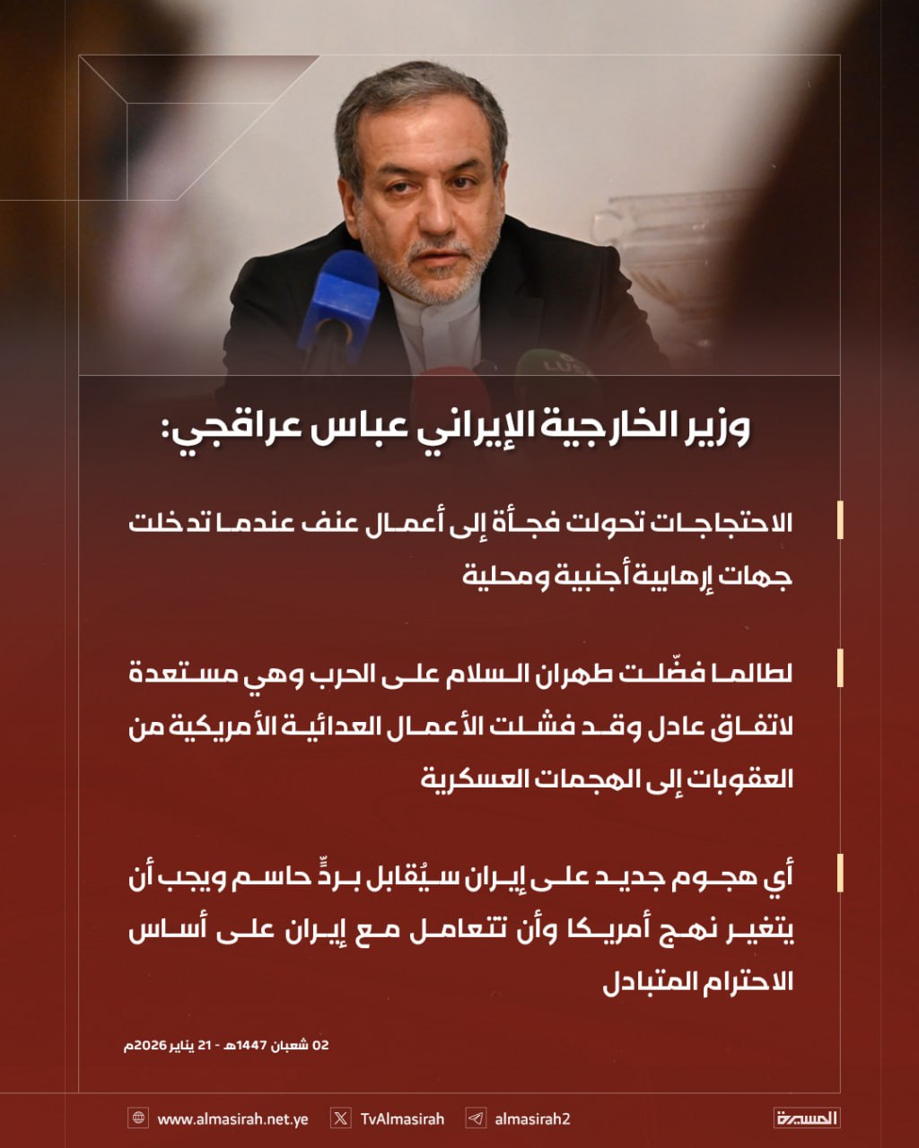 أكد وزير الخارجية الإيراني عباس عراقجي، اليوم الأربعاء، أن الاحتجاجات التي شهدتها إيران تحولت بشكل مفاجئ إلى أعمال عنف، عقب تدخل جهات خارجية، سعت إلى حرف المسار السلمي واستغلال الأوضاع لتحقيق أهداف تخريبية تستهدف أمن البلاد واستقرارها.