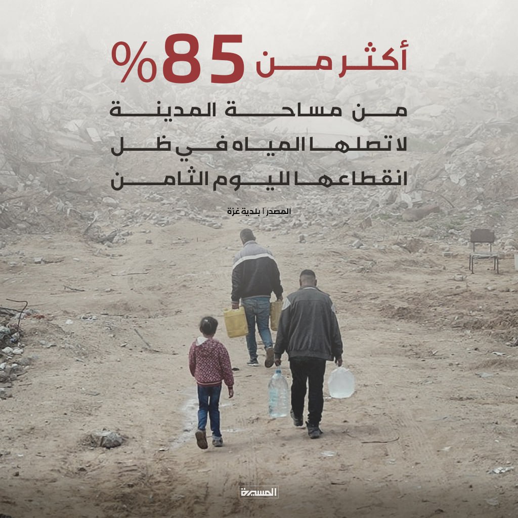 أعلنت بلدية غزة، اليوم الجمعة، أن أكثر من 85% من مساحة المدينة لا تصلها المياه، مع استمرار الانقطاع لليوم الثامن على التوالي، ما يعكس حجم الأزمة الخدمية المتفاقمة التي يواجهها السكان في ظل ضعف البنية التحتية وقيود الحصار المفروضة على القطاع من قبل كيان العدو الصهيوني.