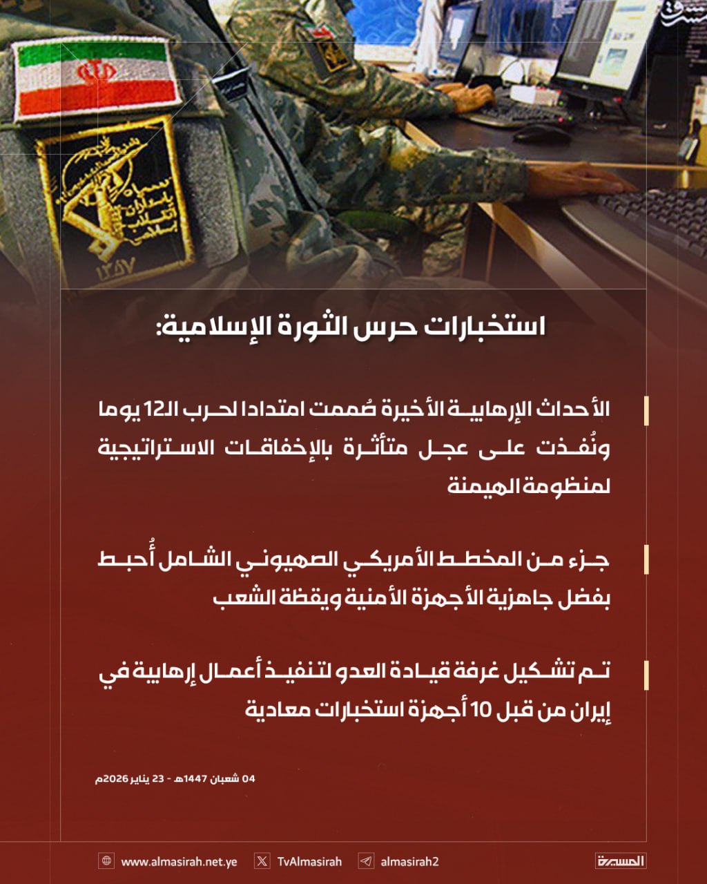 أعلنت استخبارات حرس الثورة الإسلامية أن الأحداث الإرهابية الأخيرة التي شهدتها إيران جاءت امتداداً مباشراً لما وصفته بـ"حرب الـ12 يوماً"، مؤكدةً أن هذه العمليات صُممت ونُفذت على عجل، ومتأثرة بحالة الإخفاقات الاستراتيجية المتراكمة التي تعاني منها منظومة الهيمنة الأمريكية الصهيونية في المنطقة.