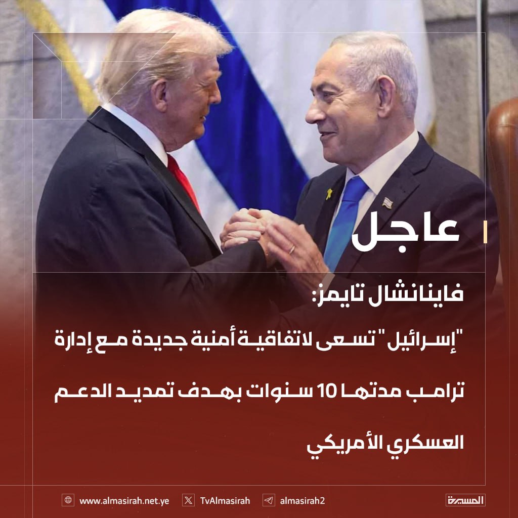 أفادت صحيفة "فاينانشال تايمز" بأن العدو الصهيوني يعمل على التوصل إلى اتفاقية أمنية جديدة مع إدارة الرئيس الأمريكي المجرم ترامب، تمتد لمدة 10 سنوات، بهدف ضمان استمرار وتوسيع الدعم العسكري الأمريكي خلال المرحلة المقبلة.-