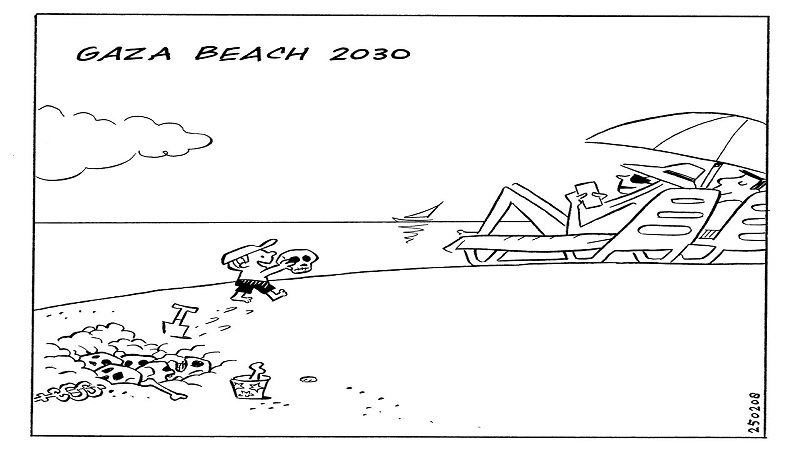 المسيرة نت: تختصر لوحة "شاطئ غزة 2030" للفنان بيتر دي ويت مشهد مستقبل غزة وفق تصورات ترامب وصهرة اليهودي كوشنر. طفل صغير ينبش الرمال ليخرج جماجم الضحايا الفلسطينيين بينما يستمتع والداه بلحظة استجمام على شاطئ غزة. هذا الكاريكاتير الذي حصد جائزة العام الماضي لرسم الكاريكاتير لم يعد مجرد فن بل صار مخططاً سياسياً. لقد كشف جاريد كوشنر صهر الرئيس الأمريكي عن رؤيته لتحويل هذا الكابوس إلى واقع استثماري.-
