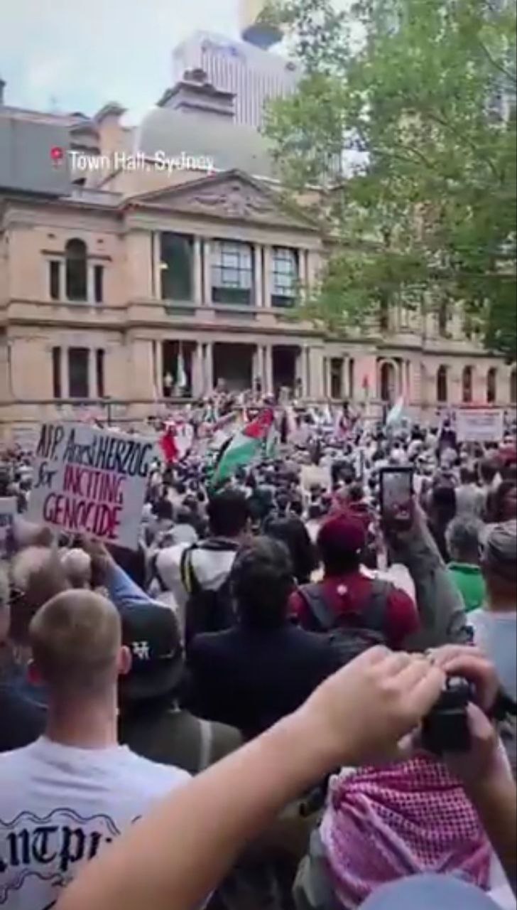الاقتصادية سيدني، تجمع آلاف المتظاهرين أمام مبنى بلدية المدينة (Town Hall) مرددين هتافات مناصرة لفلسطين ومعارضة