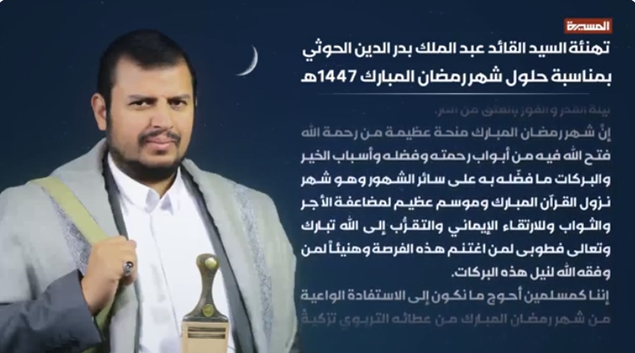 المسيرة نت| خاص: وجّه السيد القائد عبدالملك بدر الدين الحوثي -يحفظه الله- تهنئة ضافية بمناسبة حلول شهر رمضان المبارك لعام 1447هـ، استهلها بالتذكير بالغاية الأسمى من الصيام وهي نيل "التقوى" والاستنارة "بنور الله المبارك القرآن الكريم واغتنام ليلة القدر والفوز بالعتق من النار"، موجهًا أطيب التهاني والتبريكات للشعب اليمني المسلم العزيز ومجاهدي الأمة المرابطين في الجبهات ومؤسسات الدولة والعلماء الأجلاء، وإلى الأمة الإسلامية قاطبة.