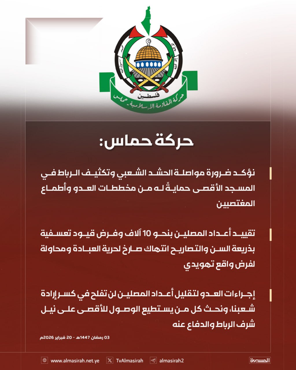 وشددت الحركة في بيان لها، اليوم الجمعة، على أن تقييد أعداد المصلين بنحو 10 آلاف مصلٍ، وفرض قيود تعسفية بذريعة السن والتصاريح، يمثل انتهاكاً صارخاً لحرية العبادة، ويكشف عن مساعٍ ممنهجة لتفريغ الأقصى من رواده وفرض وقائع جديدة بقوة الإجراءات الأمنية والعسكرية.