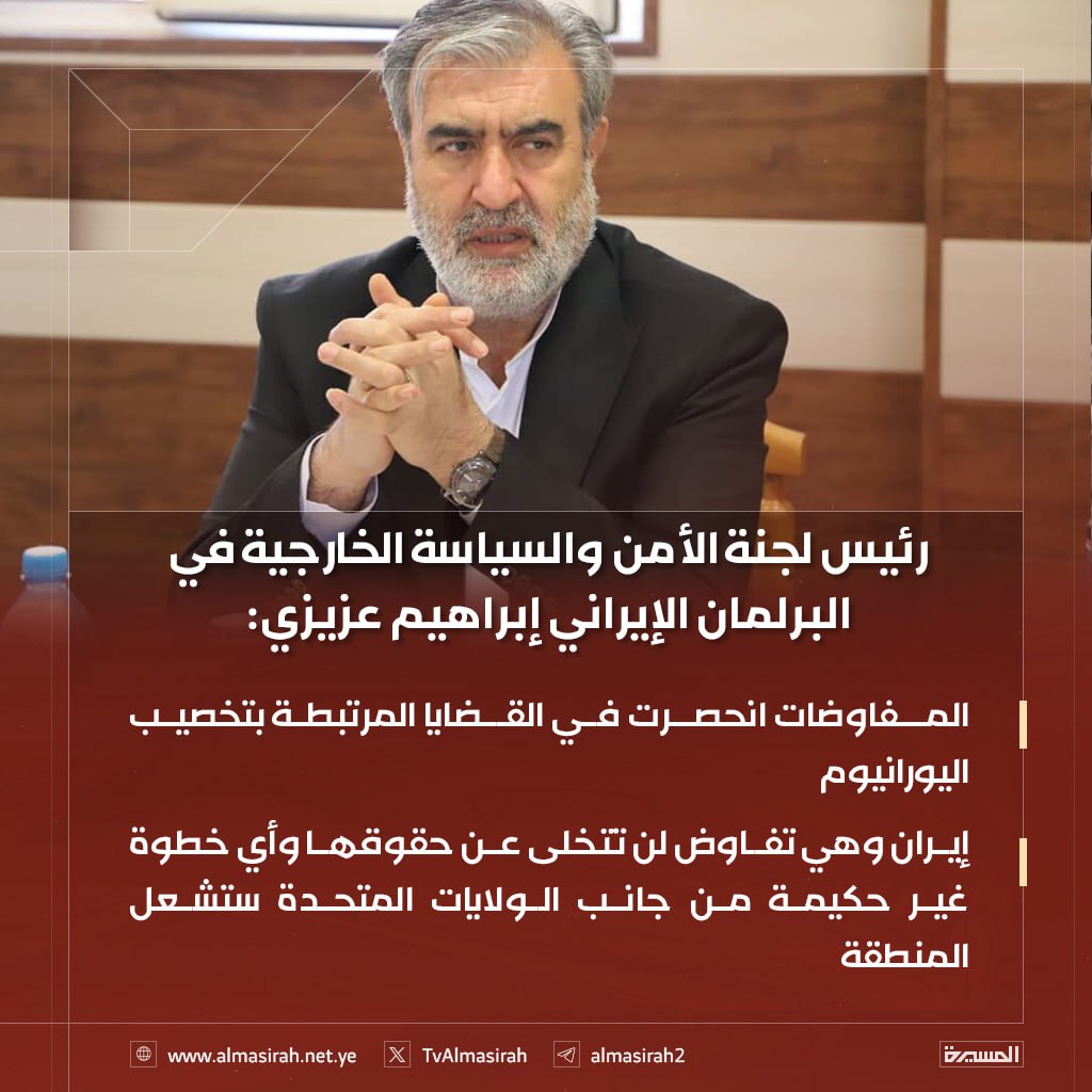 المسيرة نت | متابعات: قال رئيس لجنة الأمن والسياسة الخارجية في البرلمان الإيراني، إبراهيم عزيزي، إن المفاوضات الحالية مع الولايات المتحدة انحصرت في القضايا المرتبطة بتخصيب اليورانيوم، مشدداً على أن الجمهورية الإسلامية تتعاون من أجل تقدم المحادثات لكنها لن تتخلى عن حقوقها السيادية.