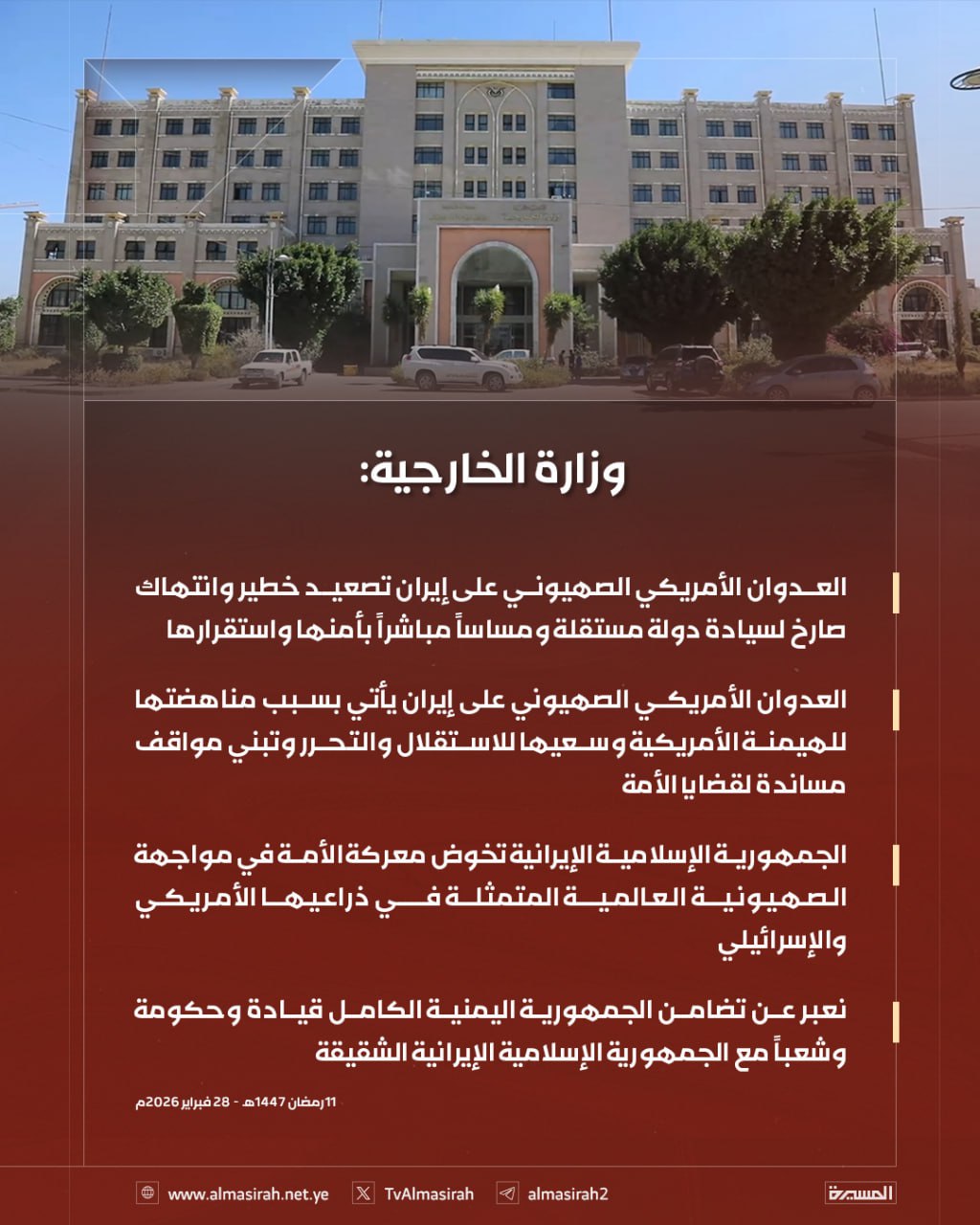 المسيرة نت | متابعات: أعلنت وزارة الخارجية والمغتربين في صنعاء، أن العدوان الأمريكي الصهيوني على الجمهورية الإسلامية الإيرانية يمثل تصعيداً خطيراً وانتهاكاً صارخاً لسيادة دولة مستقلة ومساساً مباشراً بأمنها واستقرارها.
