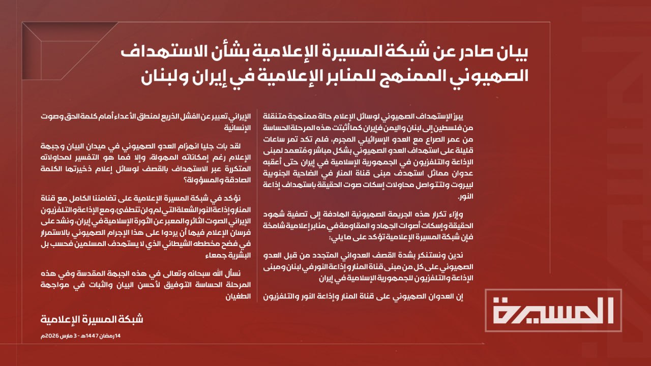 شبكة المسيرة تدين استهداف مؤسسات إعلامية في لبنان وإيران وتؤكد تضامنها الكامل