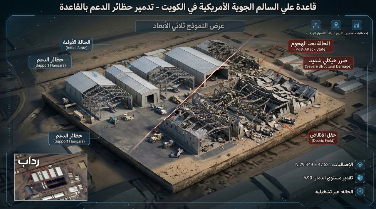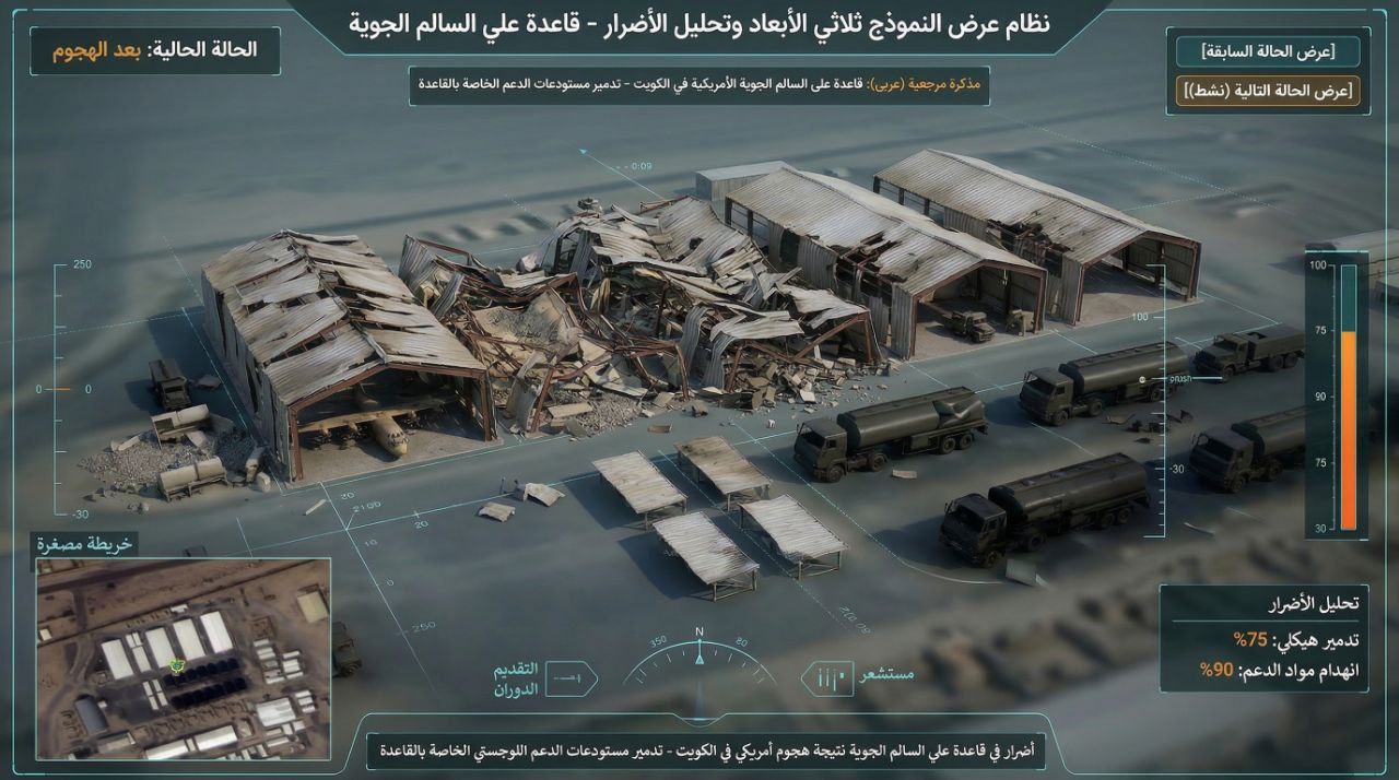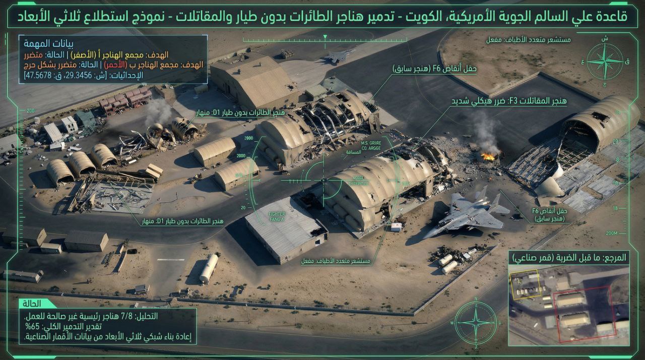 المسيرة نت | متابعات: أظهرت صور ثلاثية الأبعاد حديثة، القواعد والمواقع الأمريكية الصهيونية التي تعرضت لضربات الجمهورية الإسلامية الإيرانية، في عدد من الدول الخليجية، موضحة مواقعها الجغرافية وطبيعة الأهداف وأهميتها الاستراتيجية.