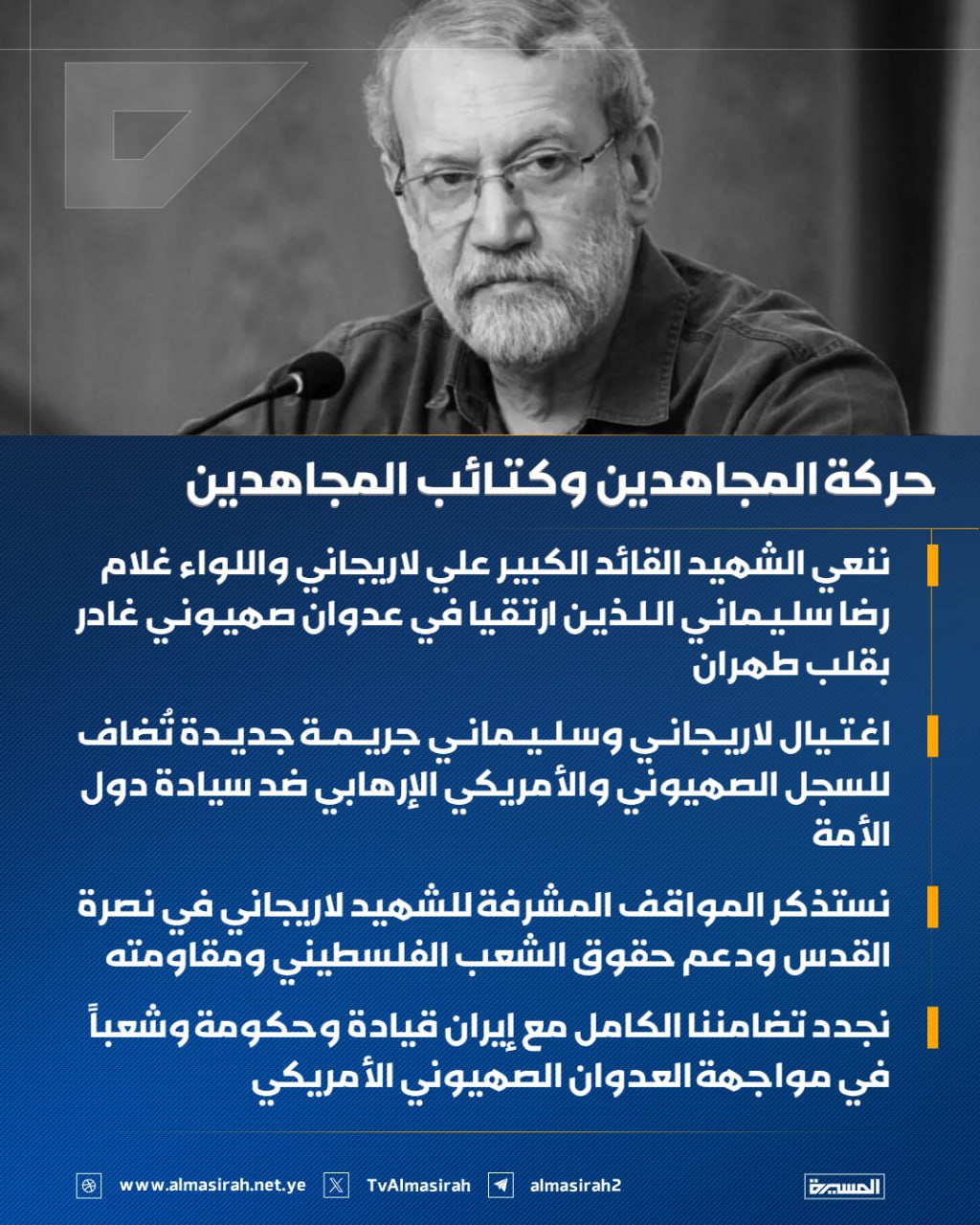 حركة المجاهدين تنعى لاريجاني وسليماني وتؤكد أن الجريمة ستزيد محور المقاومة صلابةً وإصراراً
