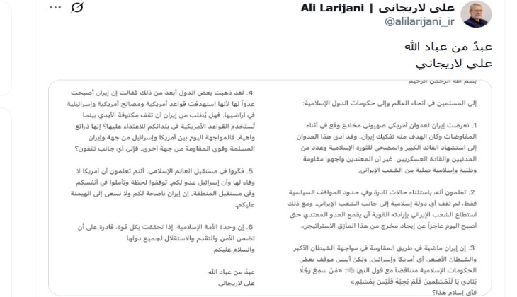 رسالة الشهيد علي لاريجاني، مستشار القائد الأعلى للجمهورية الإسلامية الإيرانية، ترسم ملامح مرحلة جديدة من المواجهة، وواجب المسلمين تجاه أمتهم.