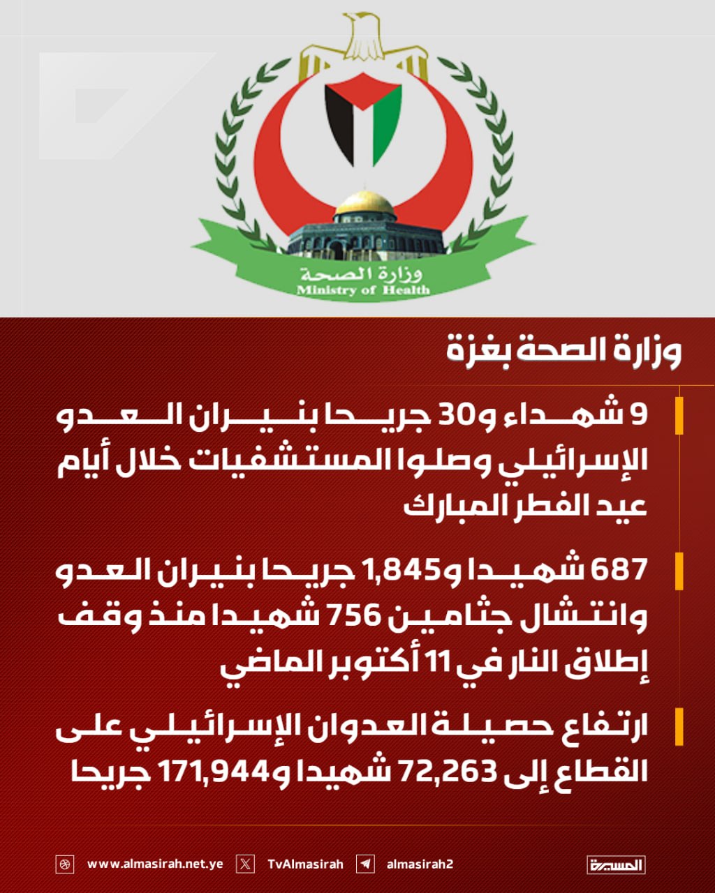 وزارة الصحة في غزة: 9 شهداء و30 جريحاً وصلوا إلى المستشفيات خلال أيام عيد الفطر