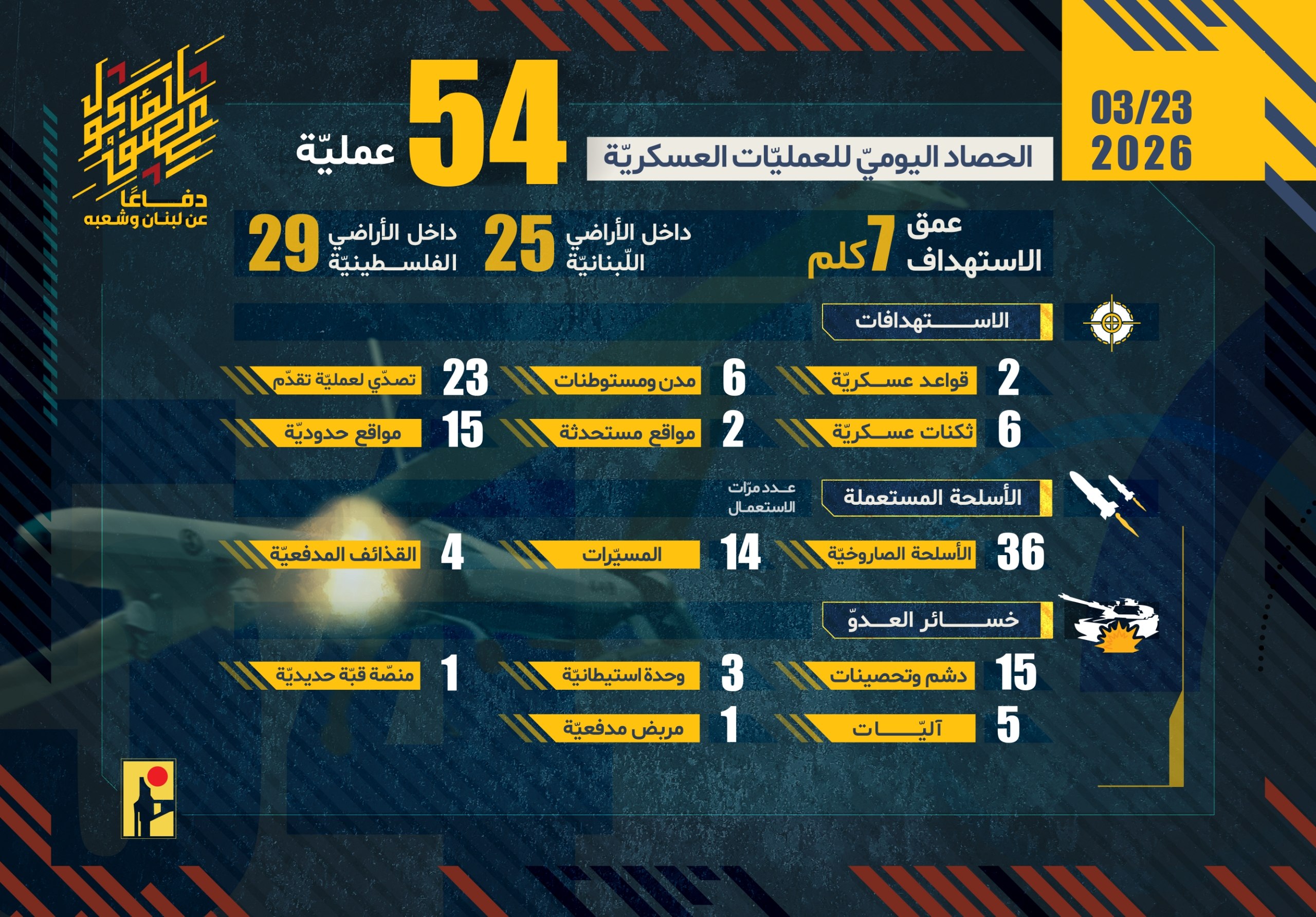 وأصدر حزب الله، أمس الإثنين، 54 بياناً عسكرياً حول عملياته ضد "جيش" العدو الإسرائيلي ومواقعه ومستوطناته في شمال فلسطين المحتلة.