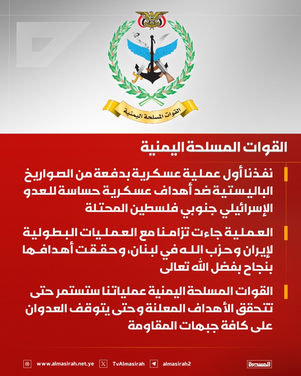 القواتِ المسلحةَ اليمنيةَ بعونِ اللهِ تعالى وبالتوكلِ عليهِ نفذتْ أولَ عمليةٍ