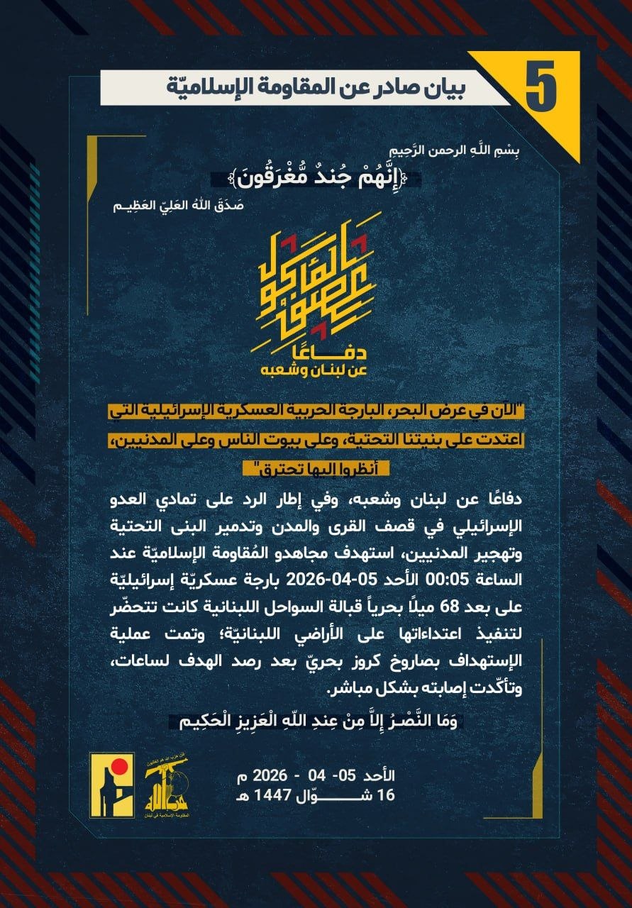 وبحسب البيان الرابع للمقاومة الإسلامية في لبنان، فقد استهدف مجاهدو حزب الله ثكنة زرعيت بسرب من المسيّرات الانقضاضية، مؤكدة في بيانها العسكري الخامس استهداف البارجة الحربية الصهيونية على بعد 68 ميلاً بحرياً قبالة السواحل اللبنانية، والتي كانت تتحضر لتنفيذ اعتداءاتها على الأراضي اللبنانية؛ وتمت عملية الاستهداف بصاروخ كروز بحري بعد رصد الهدف لساعات، وقد تأكدت إصابته بشكل مباشر.
